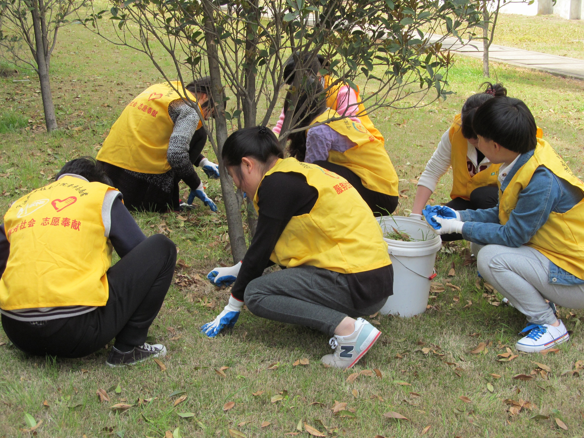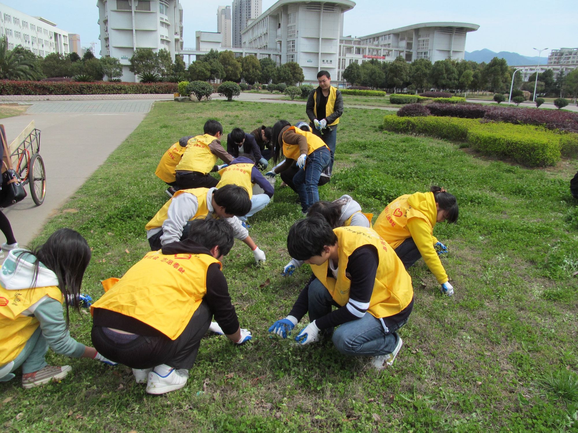 为突出本月为“雷锋月”,鼓励大家学习雷锋精神,美化校园环境,2014年3月23日下午1点,电子信息工程系义工大队于明德楼前,组织同学们开展清除杂草,清扫落叶活动。