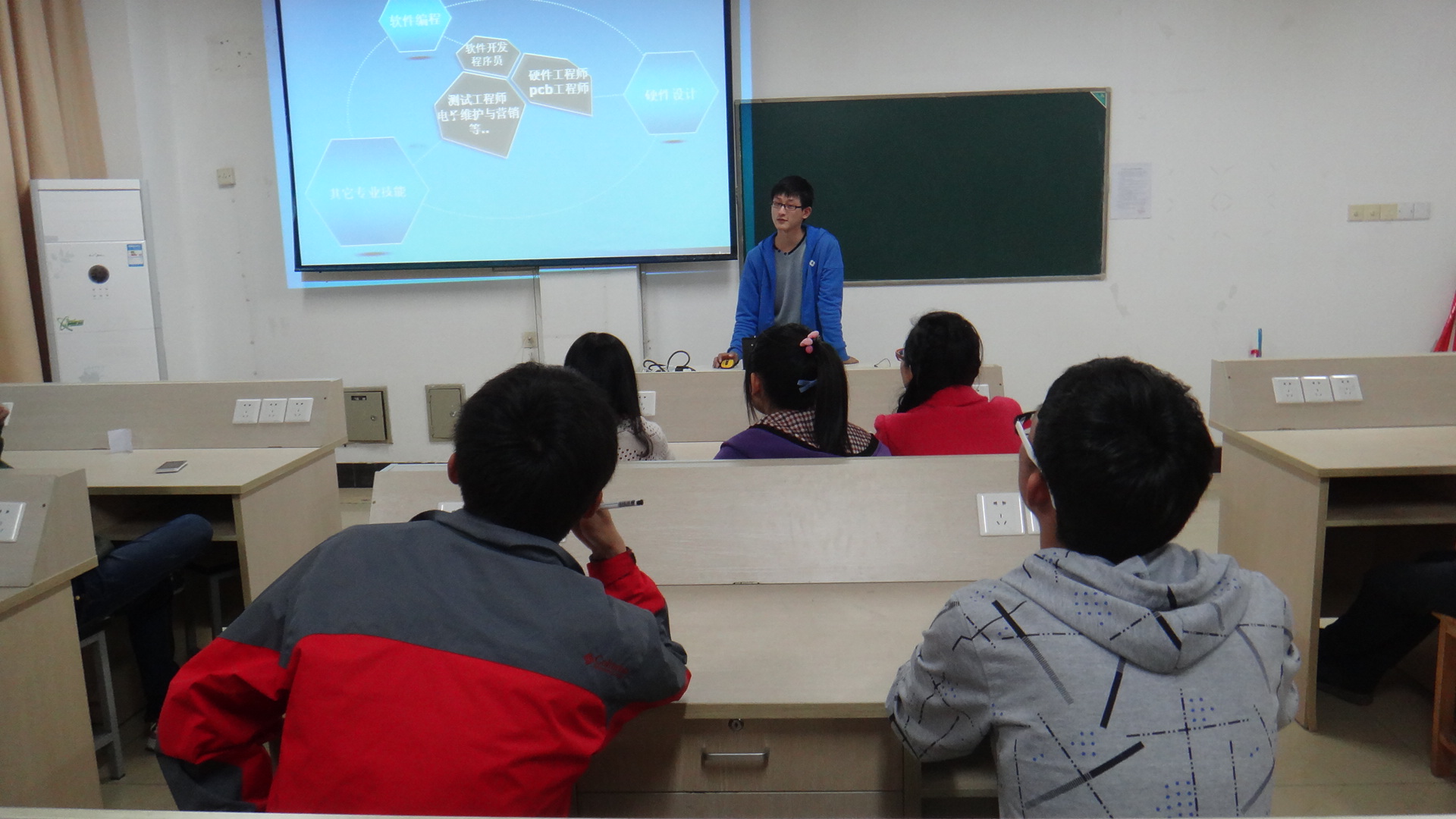 会议开始前,胡国伟老师表示:希望能通过此次会议来看到工作室成员之间的自主学习能力和各个工作室任务的进展情况。本次报告会的形式由我系机器人工作室、网络信息安全工作室、网站开发工作室、软件工作室、新能源工作室、嵌入式工作室和物联网工作室的代表上台作报告,各个工作室的代表从工作室概述,现阶段任务,成果汇报,海报制作等方面做了详细的讲解,并总结了在工作中还存在的不足之处。