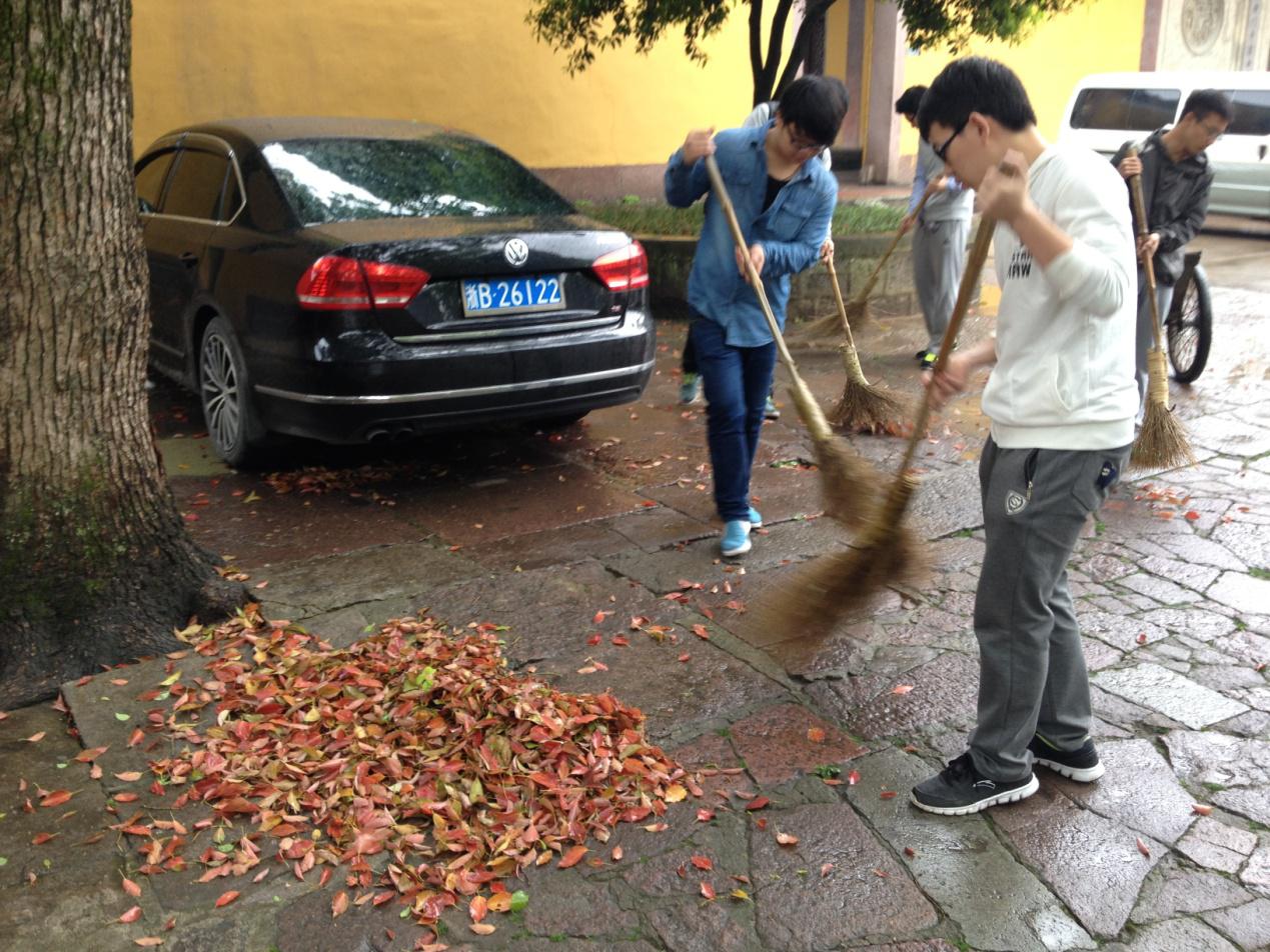 我系义工大队到达目的地后,本次活动带队队长施凯宇向参与本次活动的志愿者分发的扫帚和簸箕等活动工具。队长施凯宇进行简单的任务布置后志愿者们开始清扫寺内落叶。在清扫过程中,志愿者们进行区块划分,分工负责。一些在石缝与平时难以清理的地方,志愿用工具和手进行逐一清理,充分发挥一个志愿者不怕苦、不怕累,服务的社会的奉献精神。 经过两个小时的清扫活动,阿育王寺寺内落叶基本清扫干净,与此同时寺内游客也对我系志愿者的工作赞赏有加,并希望志愿者能多进行此类活动。