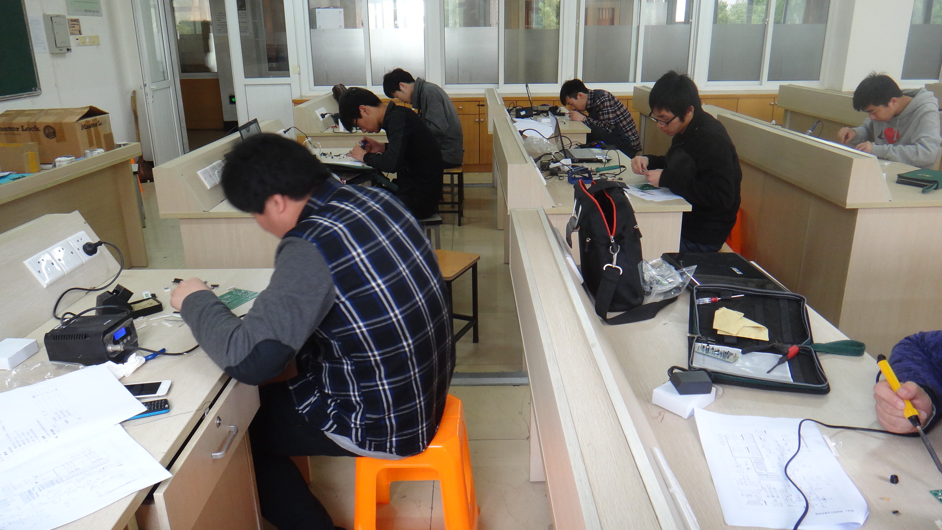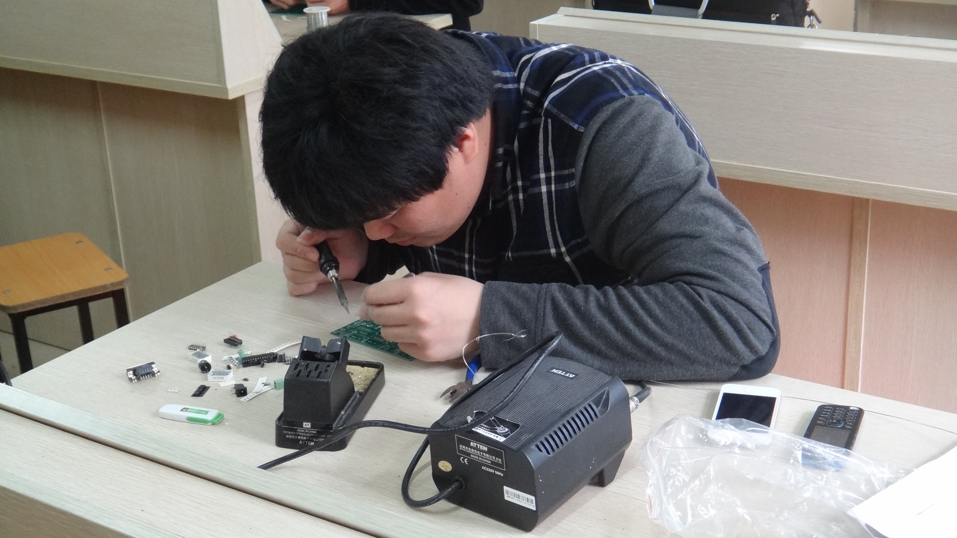 比赛开始时,各个参赛选手都取出各自的工具,开始焊接电路的工作。这是一件非常细致的工作,相对于男生来说或许有点难度,但是这并不能难倒他们,而且能够很好的完成它们。