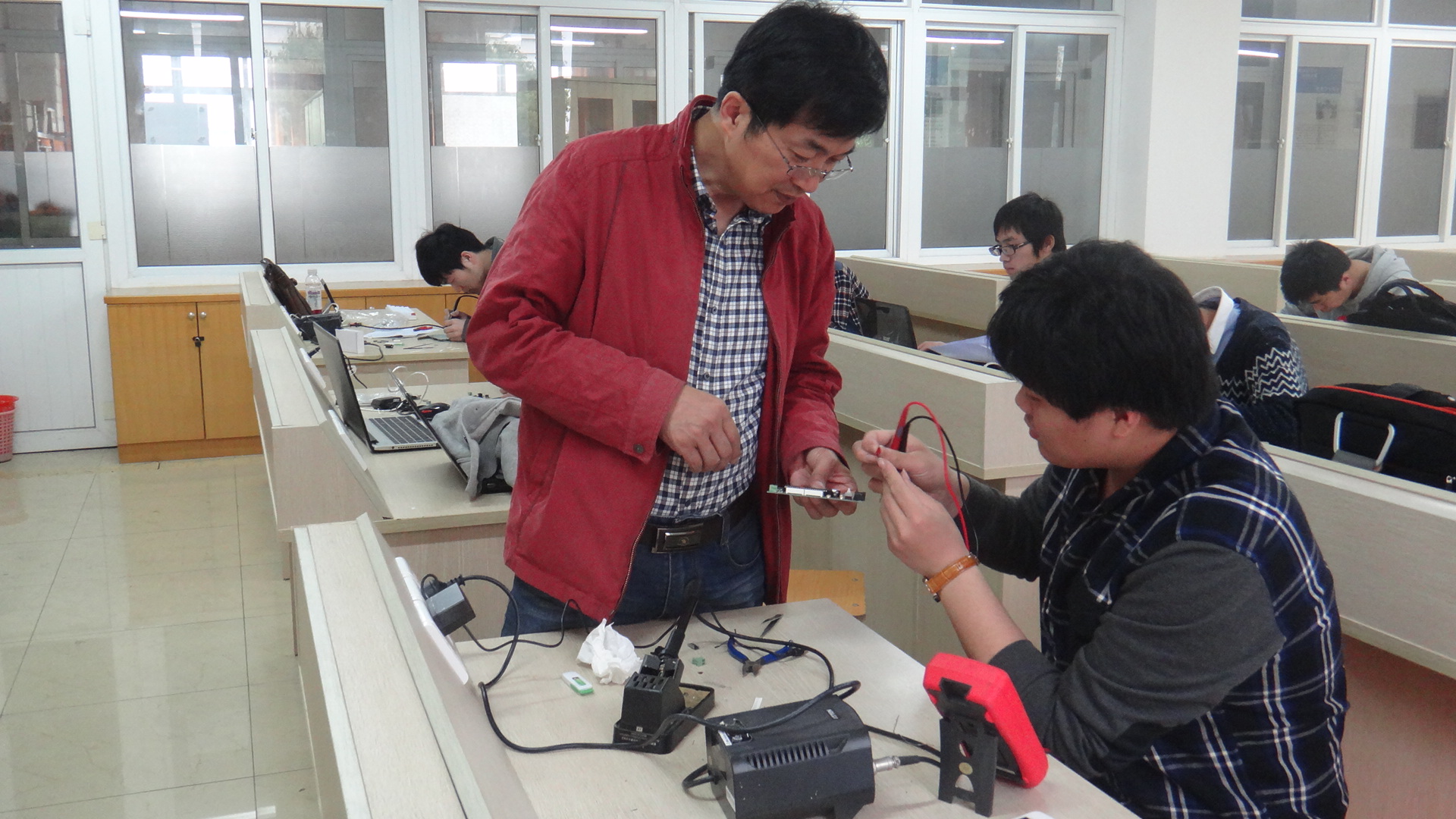 2014年4月25日下午1点,电子信息工程系于敬业楼210举办了智能产品调试比赛,并由我系张溪老师作为此次比赛的主考官。 本次比赛由大一及大二电子专业的学生为参赛成员。比赛共分成四个部分:电路组装、电路分析与计算、电路与程序调试以及调试结果分析。在比赛开始之前,老师向给每人分发一份数字电压表头设计与制作任务书与比赛所需的材料,其中包括比赛的任务及比赛过程中需要注意的事项等。