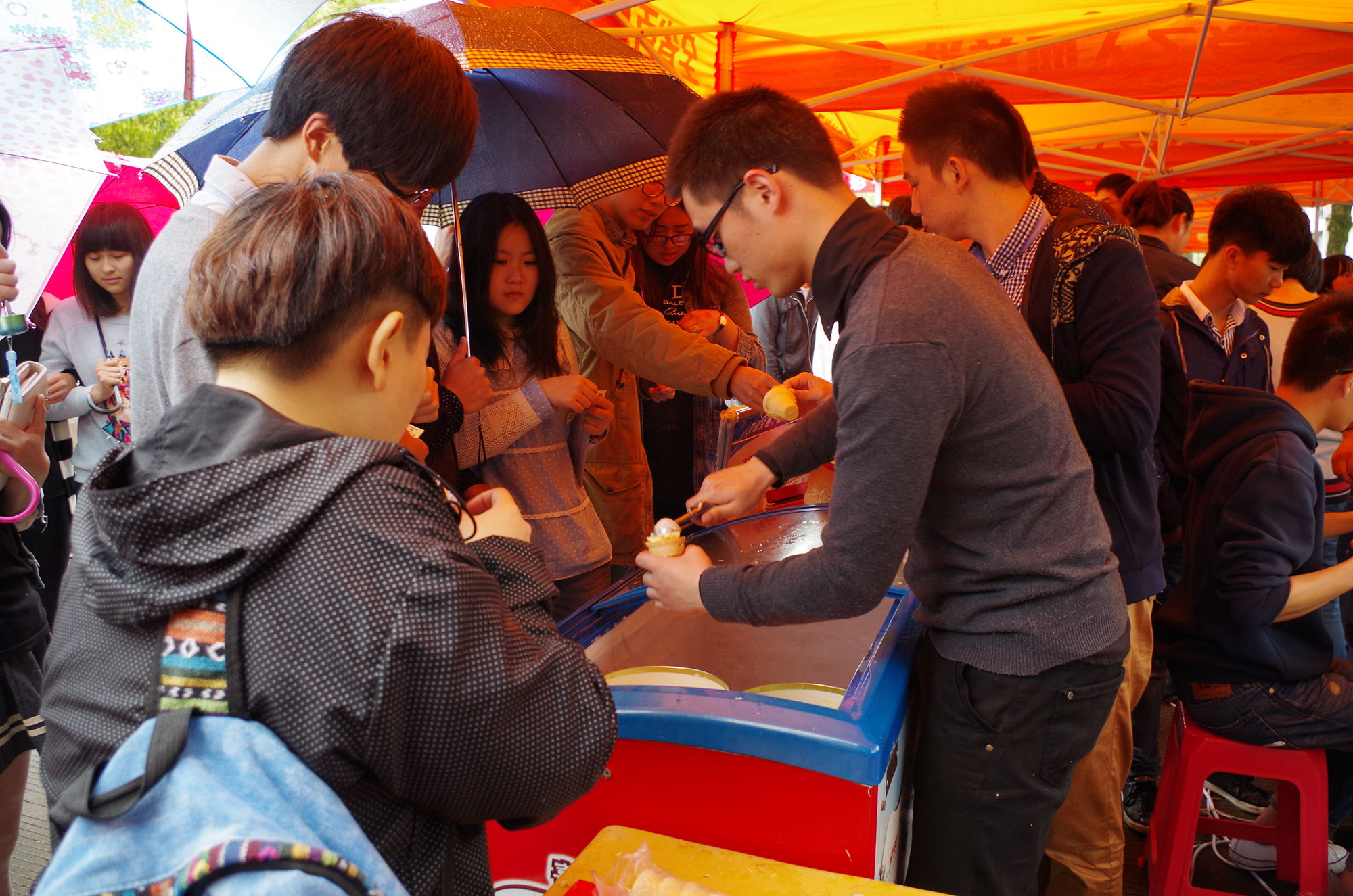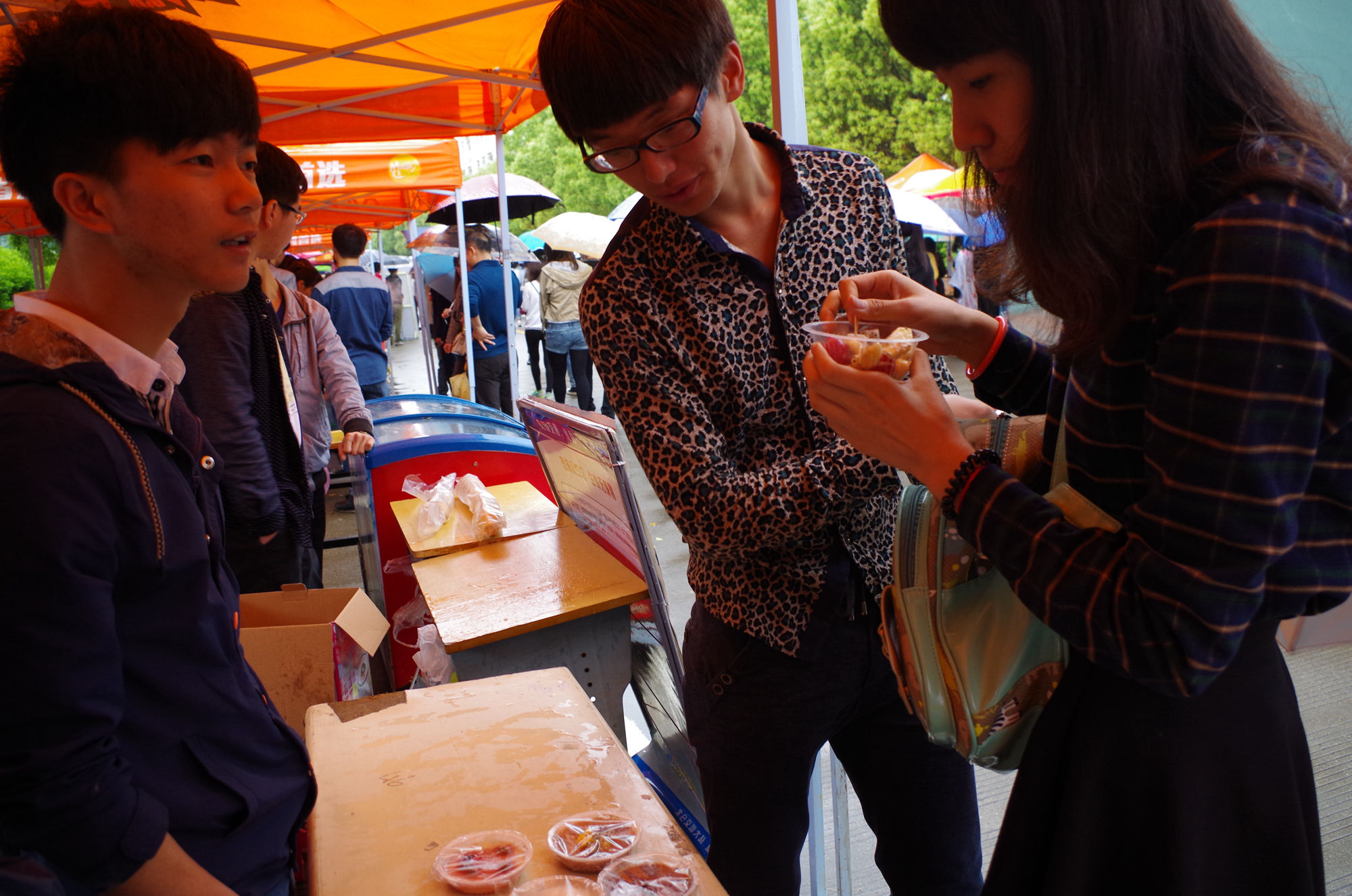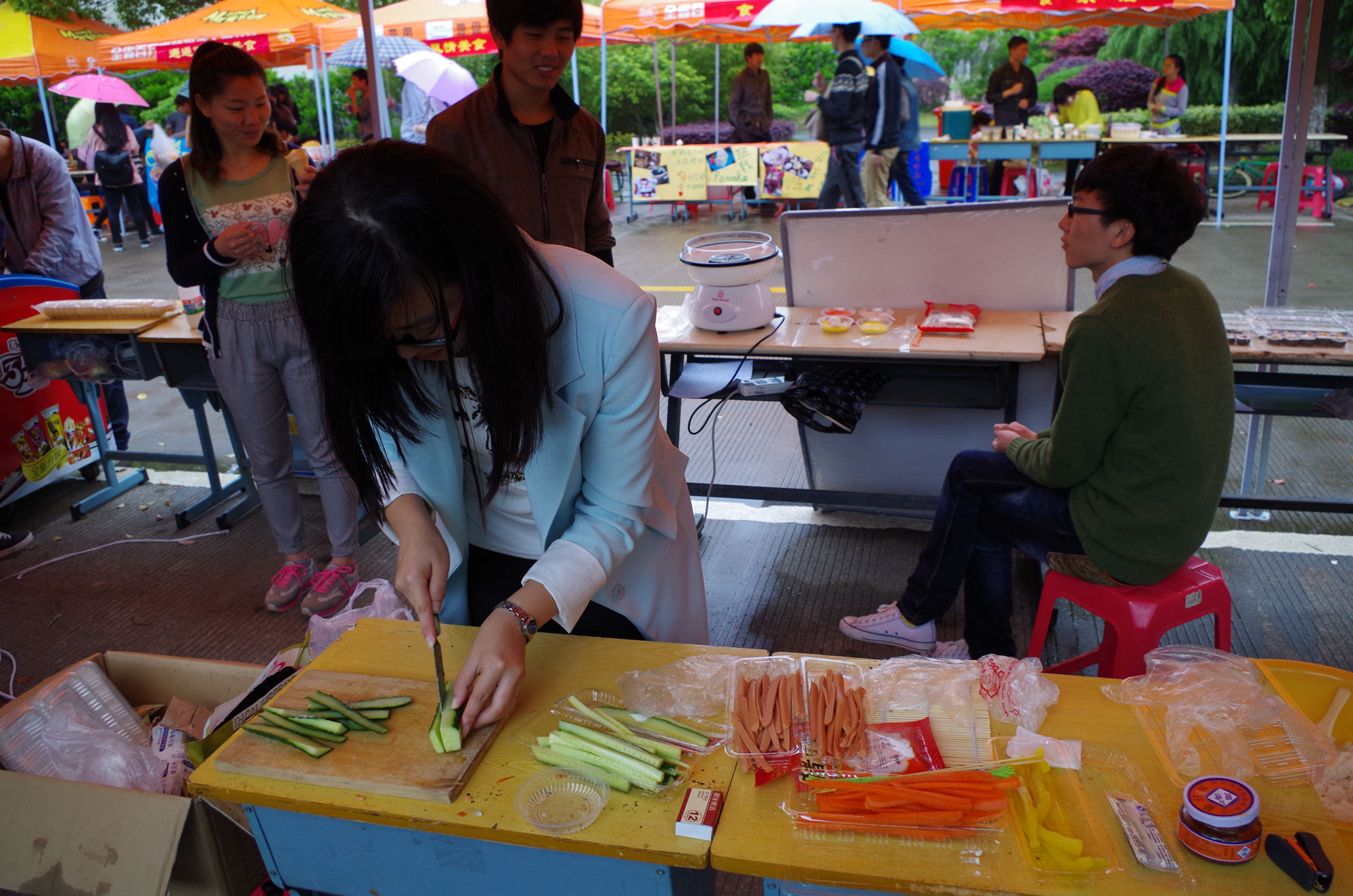 上午9点,虽然阴雨绵绵,但仍然阻挡不了师生们欢度校庆的热情。在自制美食区里,要说哪里人气最旺,一定少不了电子信息工程系的摊位。眼睛看、鼻子闻、舌头尝……正因为你的感官都被美食所牵引,估计你很难注意到美食身后的那些面孔,那些工作学生忙碌的身影。所以你更难想象,当你吃得心满意足时,他们却默默的坚持在工作岗位上顾不上喝水和吃饭,一天足足要站上十多个小时。
