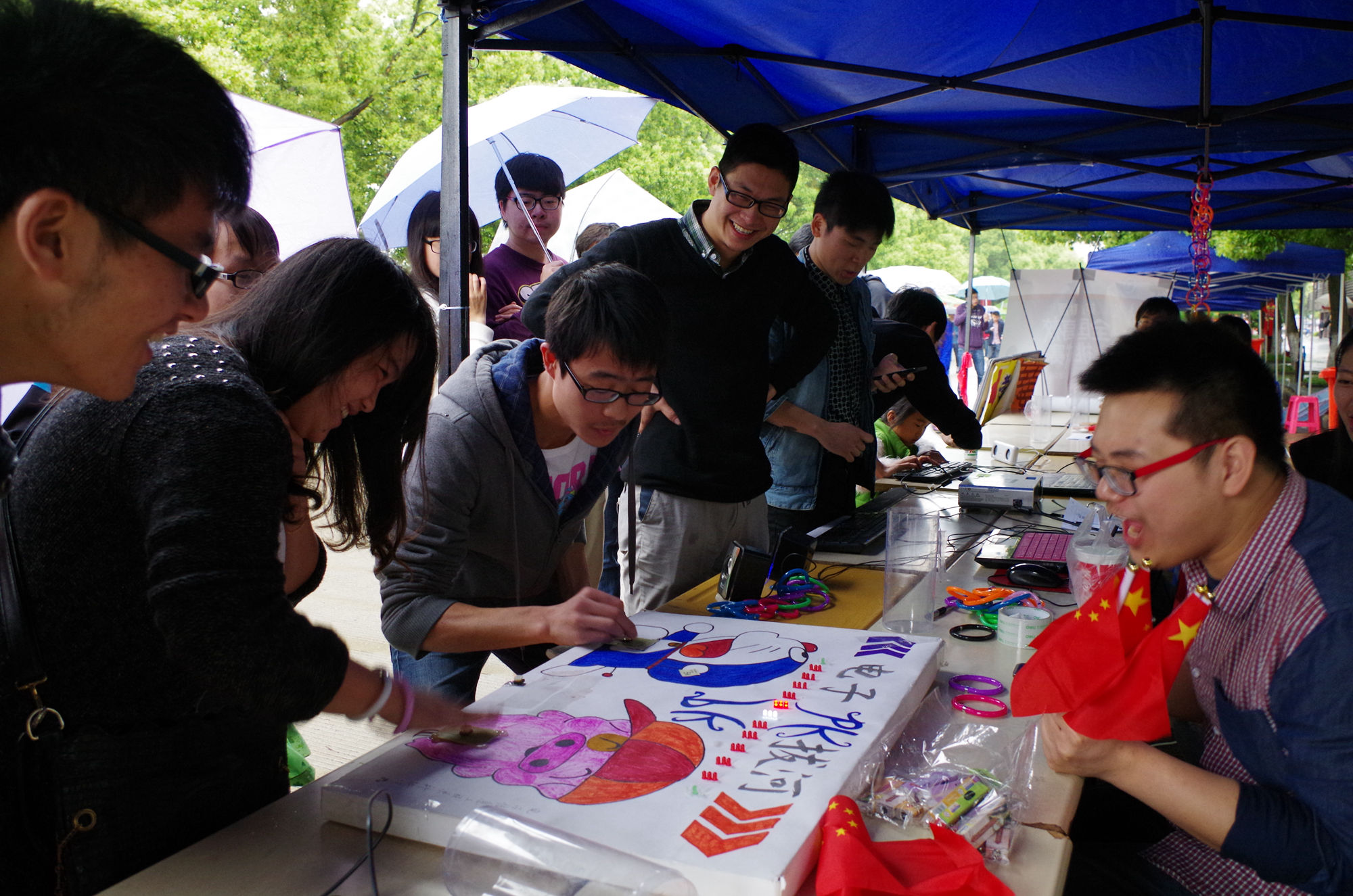 我系游戏项目为“伤心的大头”,“灵动指尖”、“电子拔河”。伤心的大头游戏规则为参赛者蒙上眼睛站在线外,走到画有“大头”的画板上并将鼻子放在“大头”的准确位置,此项目主要考验参赛者的平衡能力以及判断能力;灵动指尖游戏规则是参赛者两两参与进行拳皇比赛,此项目主要是为了让参赛者回忆起童年的游戏时光。电子拔河是两名参赛者在两边分别在电子板上快速摁键,频率快的获得胜利。参与游戏便可得到奖品,参赛胜利者可获得手电筒,将三个比赛全部通过并且时间最短就可以得到神秘大奖。