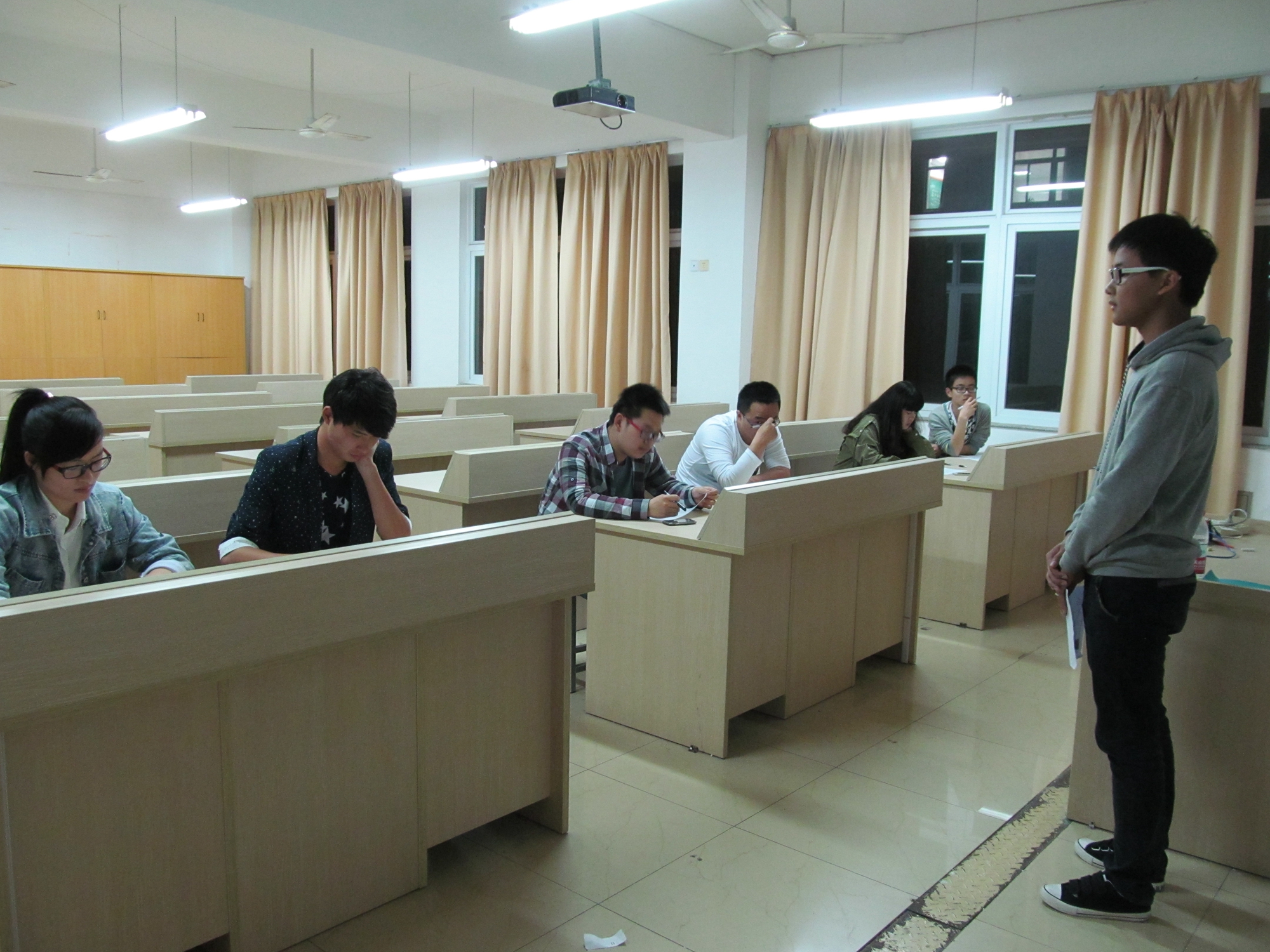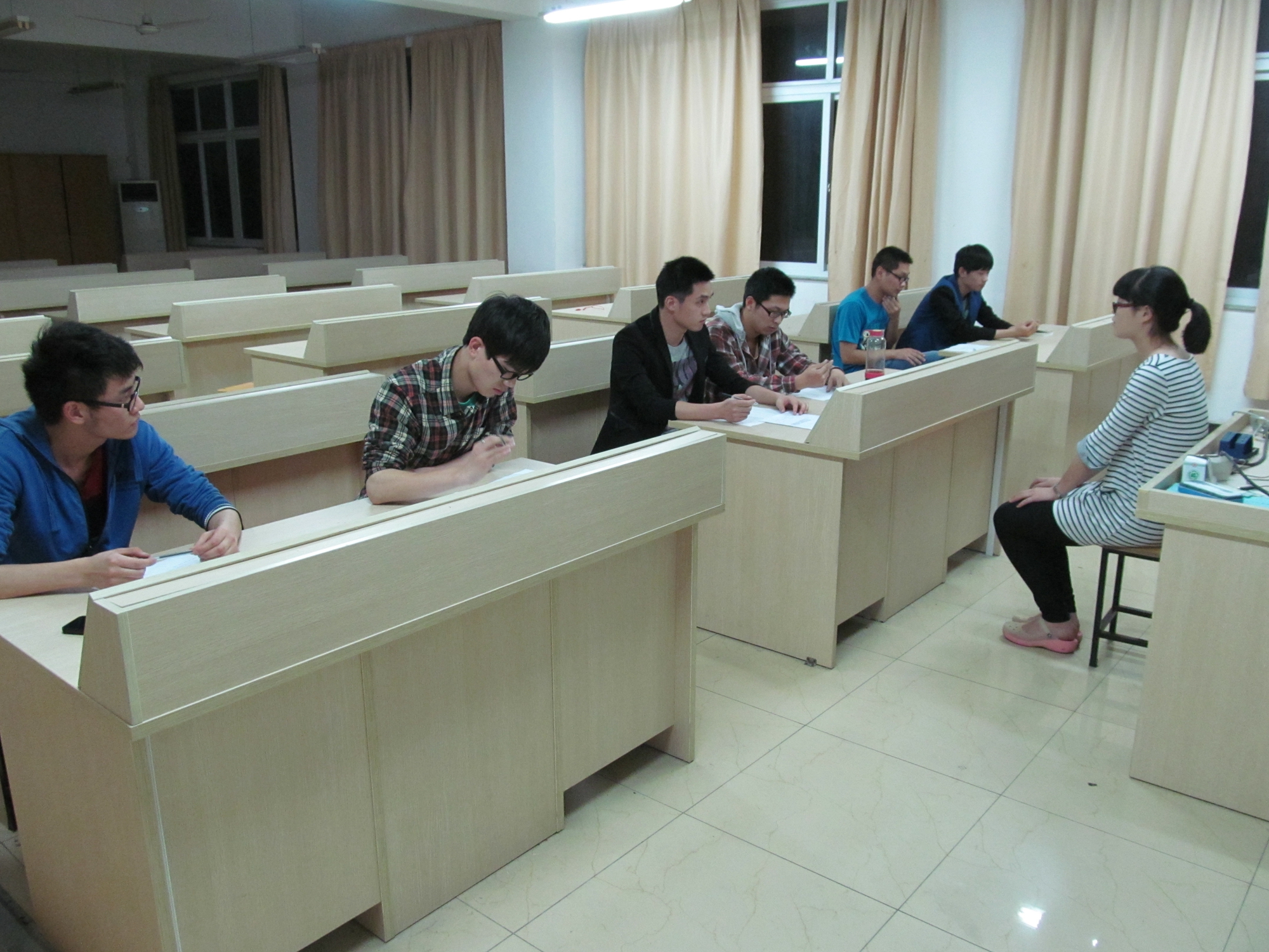 2014年5月7日晚上7点50分,电子信息工程系于敬业楼210、214、228教室,召开了团学助理的初次面试,并由各部门的部长作为此次面试的面试官。 此次面试为口试,其内容包括:1、简单的自我介绍;2、回答面试官提出的问题。面试者在开始之前于等候室209等待,随后由工作人员带领到面试场地进行面试。本次面试的目的是为了选取新一届的部长助理,为我系团学干部队伍招收新人才。 面试开始之前,各个部门首先整理了收集过来的面试申请表,将面试人员的名单汇总、划分成3个小组,每组12人,共36人。再将申请表交给工作人员,并分发给每个面试者,作为此次面试的凭证。