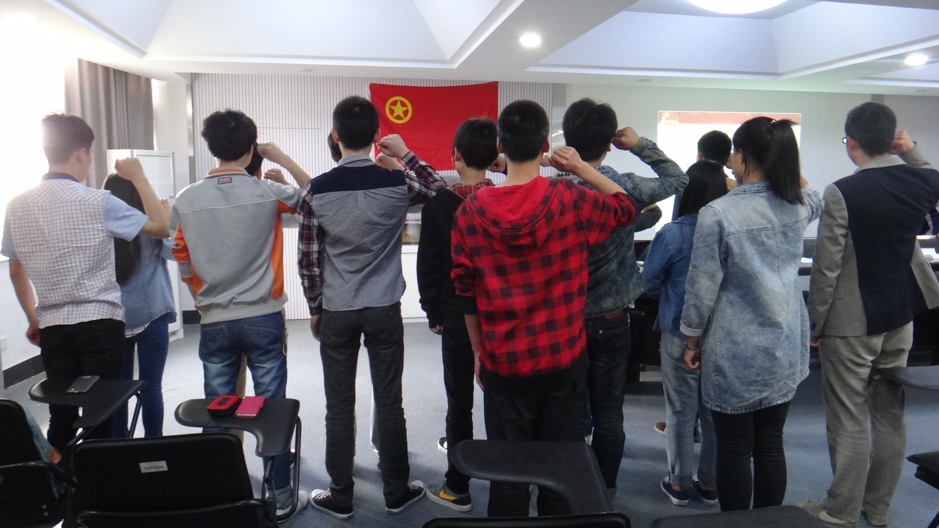 图为:入团仪式现场 入团仪式由组织部部长郑策主持,并且在庄严的国歌声中拉开了序幕。首先,我系团副王淑敏宣读了新团员名单,并由教师和老团员代表为新团员授予团员标志——佩戴团徽。接着,举行新团员入团宣誓仪式,新老团员在团旗的见证下,握拳举起右手,庄严宣誓:“我志愿加入共产主义青年团,坚决拥护中国共产党的领导,遵守团的章程……共产主义事业而奋斗!”洪亮的声音,振奋人心。随后,老团员代表也作了发言,为新团员送上了祝福、表达了期望,使出席的新团员备受鼓舞。