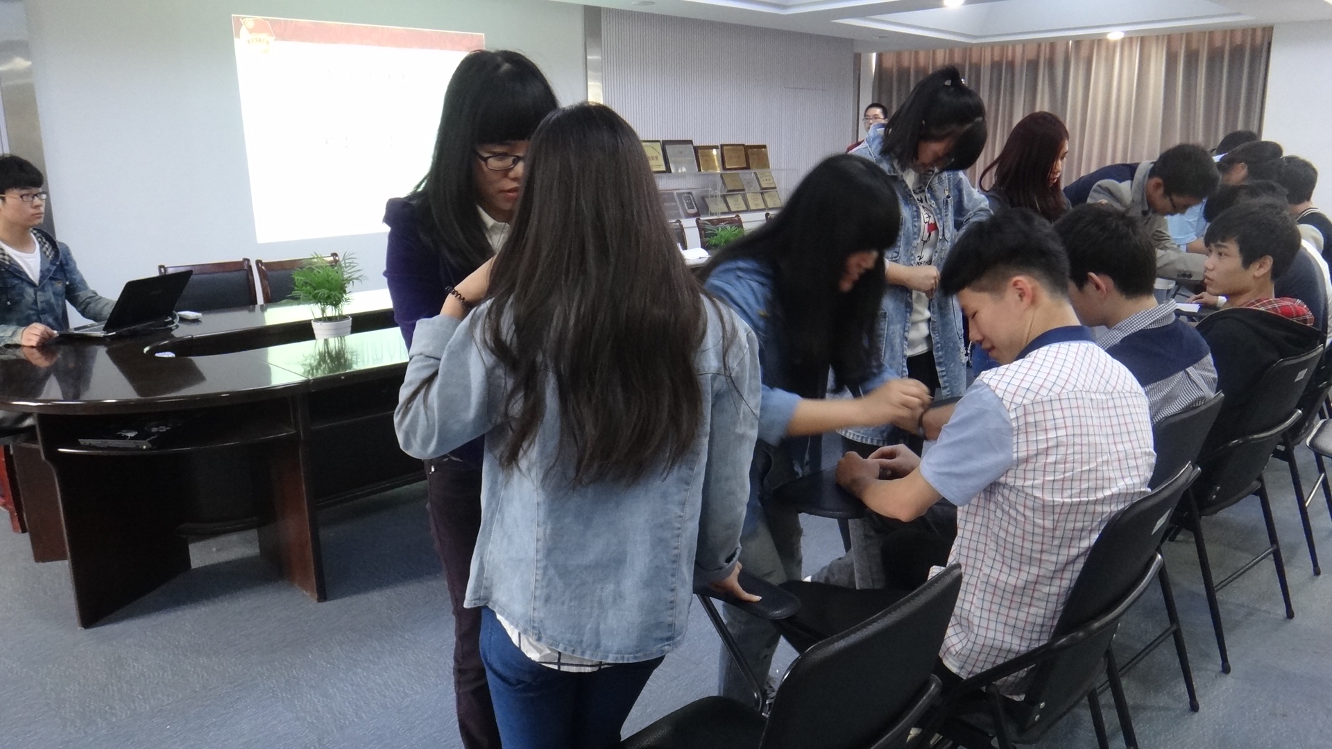 图为:老师与团学干部在为新团员佩戴团徽 在会中,电子3113班的褚江南作为新团员代表发言,向团组织表明了自己的决心:要牢记团的誓言,增强为共产主义奋斗的信念,要以团员的标准严格要求自己,努力学习,不断进取,做一名合格的共青团员。