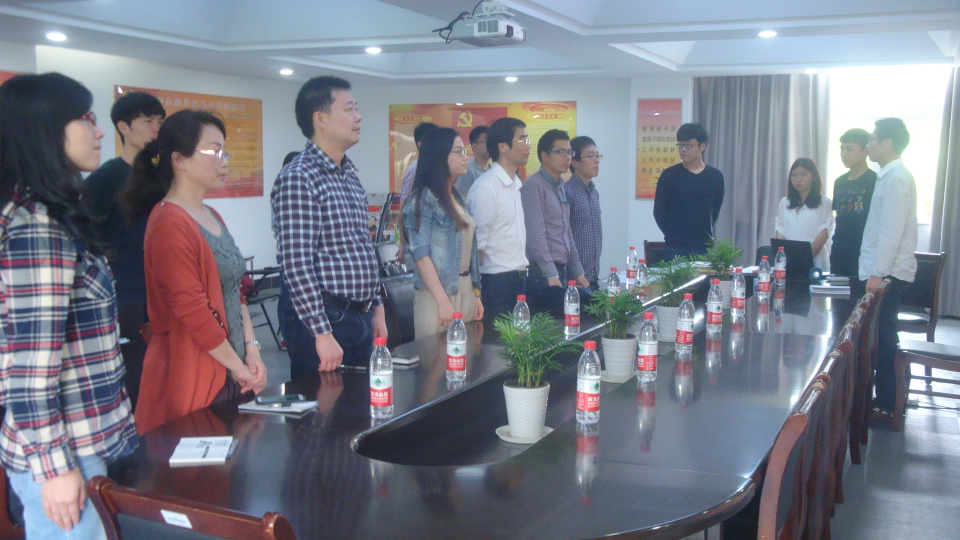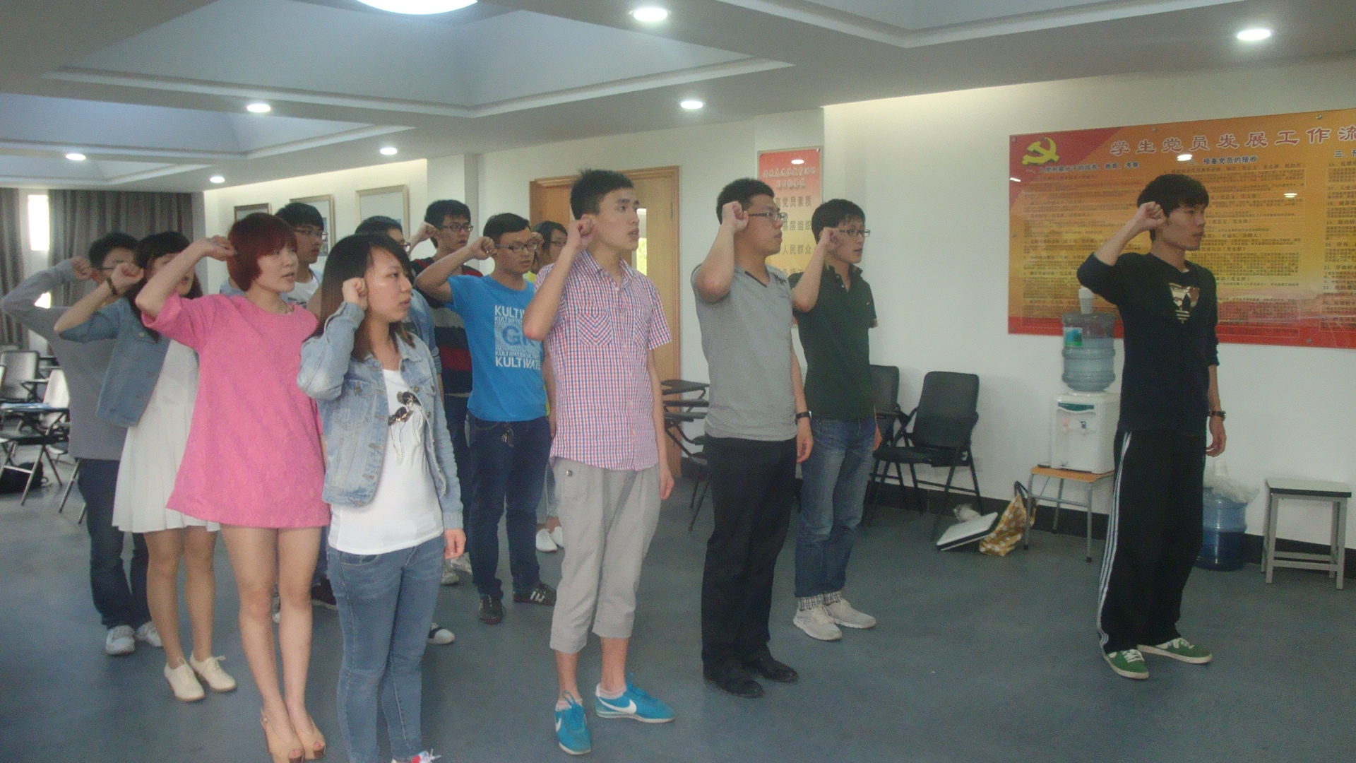 2014年5月16日,中午12点整,电子信息工程系于敬业楼二楼党员之家召开了电子党支部大会,并由电子信息工程系辅导员刘利峰老师主持此次大会。 本次大会主要议题是讨论金立、张露在内的14名位同志由积极分子转成预备党员及由预备党员转成正式党员的问题。本次大会共五项流程:一、奏国歌;二、转预备流程;三、转正流程;四、党员、预备党员宣誓。