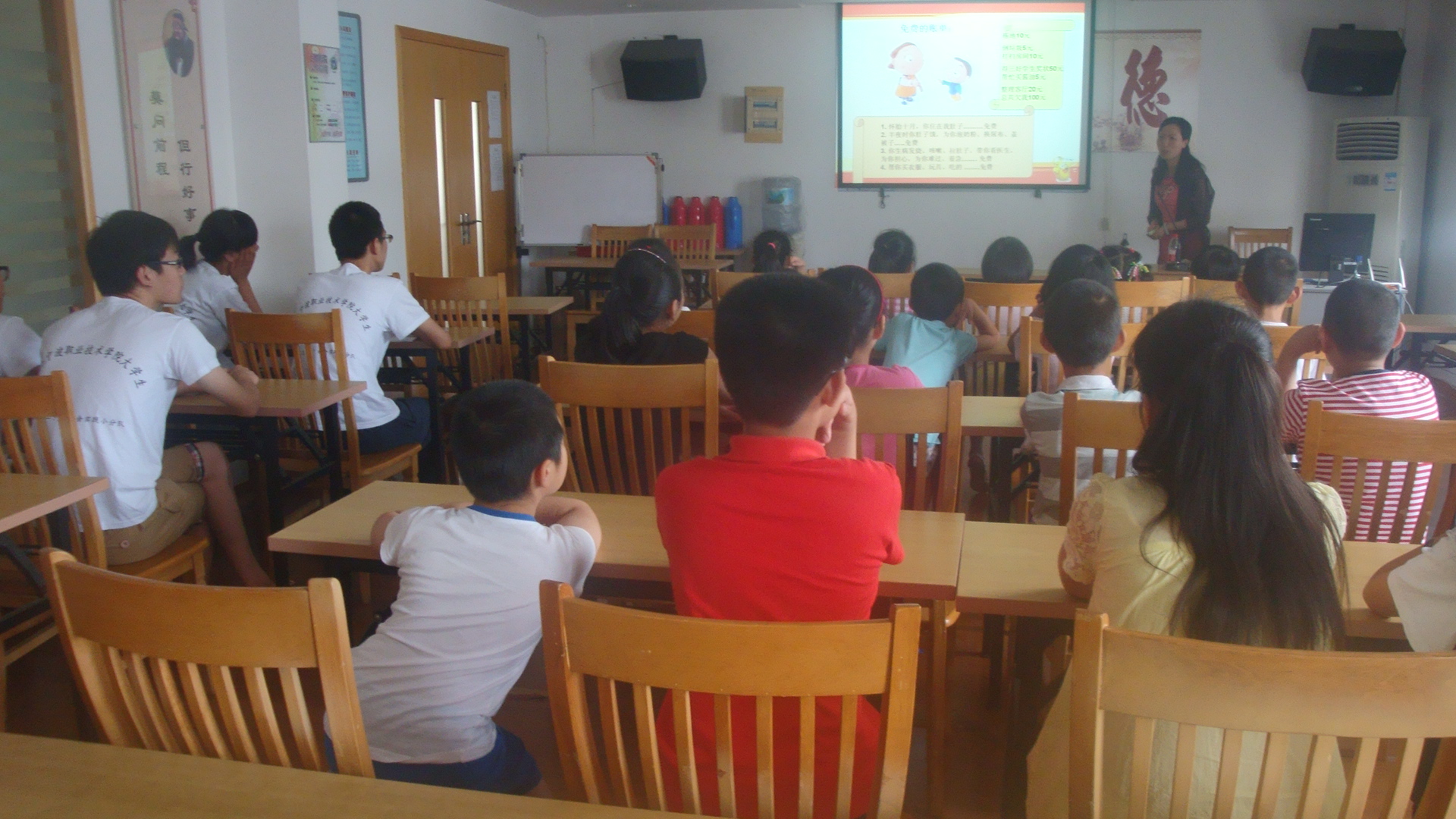 在下了一个星期雨之后,我们暑期社会实践的第一天支教天气便放了晴,天气虽然很闷热,但是大家的热情丝毫不减,早早地来到了约定的地点。 夹杂着热情和紧张的心情,我们一行10人上了公交车,在车上闲聊不一会,就到达了目的地—黄鹂社区。在队长和黄鹂社区负责人简单交涉之后,负责人给了我们签到表,随后告诉我们小朋友在五楼,让我们先去给小朋友签到,管理秩序。我们显然没有意料到第一天就要直接开始看管小朋友,带着一丝焦虑上了五楼。 当我们到了教室,小朋友们却主动热情和我们打招呼。很快的我们就和小朋友们聊成一片。虽然有些小朋友很吵,但也不失可爱。 今天的课堂是讲座,关于百善孝为先,小朋友们在讲座过程中认真的跟着老师的思路朗读弟子规,积极主动发言,丝毫不怯场。对于我们来说,小朋友们的很多东西都值得我们去学习。看着一张张认真、单纯的小脸蛋,我对于之后的支教生活反而更多了一些期待。