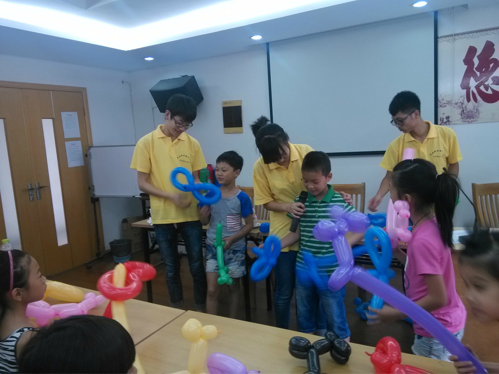 今天的两个活动分别是玩转魔术气球和关爱留守儿童送书活动,由于两个活动是同时进行的。我们志愿者小组分配成了两组,一组送书活动是由黄鹂社区的老师带队给社区的留守儿童送去我们和社区关爱和温暖,另一组在玲珑的主持下,汪家峰开始教导小朋友们做气球,我们和小朋友们一起用气球来做出各种形状的小动物和“武器”。小朋友们都玩得很开心、很投入。当小朋友们做好自己作品之后,小朋友们为自己所做的小动物起一个好听名字,然后让他们上台来介绍自己的小动物,最后让小朋友们来投票,最后得票最高的小朋友获得了精美礼物。