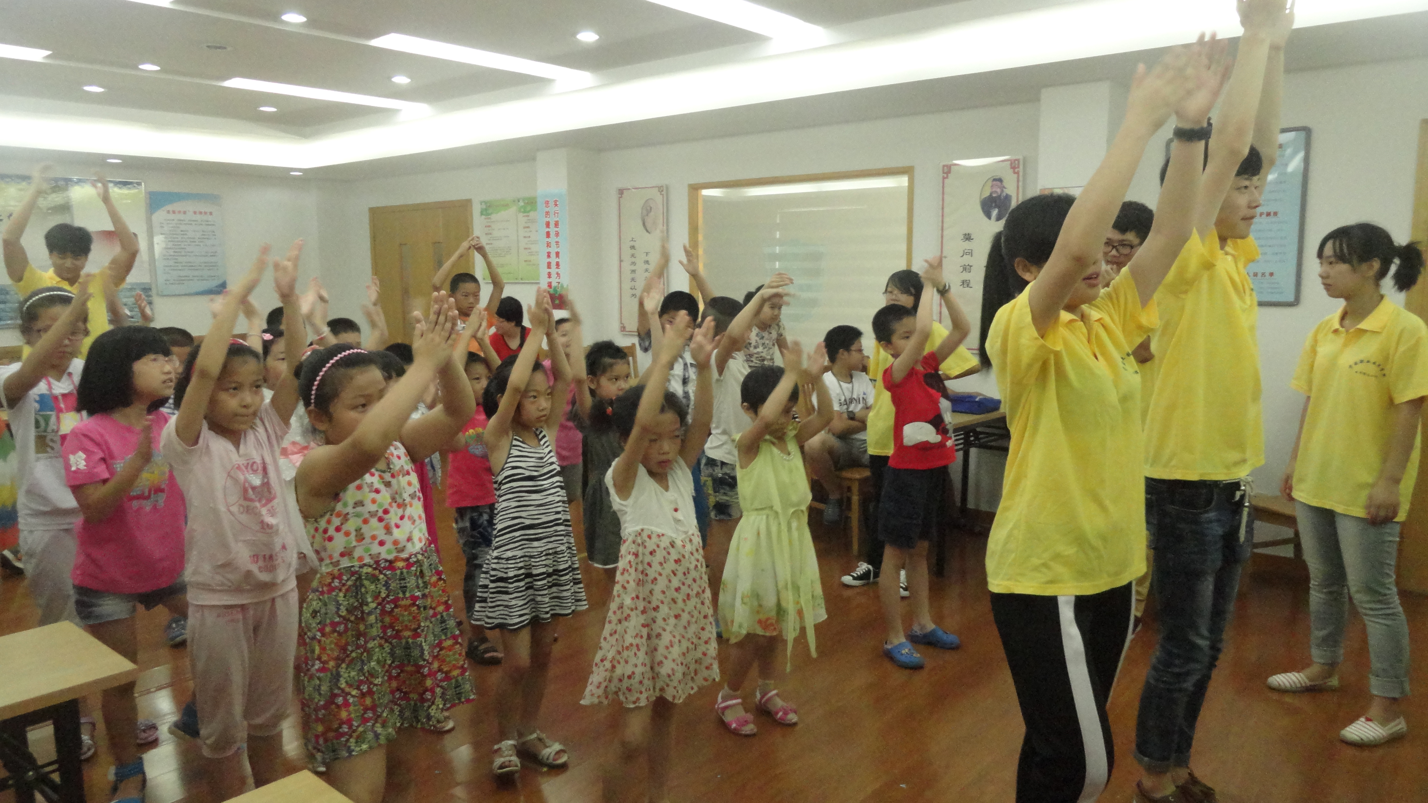 风和日丽,阳光明媚,我们早早的按捺不住自己的心,踏上这又一天的征程。每一次爬上去教室的楼梯,都会有小朋友在呼喊着“加油”“加油”,是开心,是喜悦。一张张可爱的笑脸、一个个纯真的动作,让我们不禁微微一笑,真是一群可爱的小朋友。 跟往常一样,我们还是先指导小朋友们写暑假作业,等小朋友们到齐了以后,我们教了小朋友一个卖萌舞蹈——兔子舞,这是我们精心挑选的小舞蹈,让孩子们更萌一点。