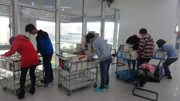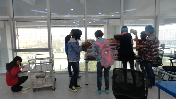 本次活动由电信学院义工大队组织,共有10人参与此次活动,主要负责图书馆四楼图书的收集与整理。在图书管理员简要说明整理方法后,同学们紧张有序地投入到图书分类整理、搬运、上架工作中。搬运量大,同学们便排成长龙,协同搬运;整理过程发现有书落上灰尘,就细心地擦净。按书号准确筛选、分类图书,并将书一摞摞放回指定书架,将借书同学放错的书找出并放回原位。同学们认真负责的态度和高效的工作方法赢得了图书管理员的由衷赞赏。