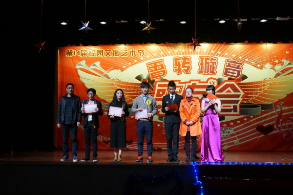 | 为丰富电信学院学生的校园文化生活,展示学生灿烂青春风采。2014年11月30日晚上6点在李惠利大剧院,电信学院举办了以“用音乐点燃激情,用歌声诠释生活”为主题的吾转璇音总决赛。本次比赛邀请电信学院党总书记龚有国老师、团委书记陈宇老师、辅导员刘利峰老师、辅导员陈洁琼老师担任此次活动的评委。 此次比赛经过一个月的层层选拔,共有十位选手进入决赛。选手们将在舞台上尽情展示自我的才艺,诠释青春的飞扬。比赛共两个流程:第一轮为选手自选歌曲演唱,每位选手将演唱一首自己拿手的歌曲,经评委评分后,得分前五的选手方可进入第二轮抽签选择歌曲来角逐此次比赛的前三名。