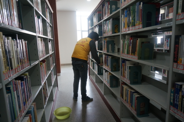 活动过程中,志愿者们分工明确,拿着抹布和盆盛满水开始清洁,一格一格地将书架内外的脏垢和书上的灰尘擦拭干净,不放过任何一个死角,高处擦不到的地方要踩着梯子上去,看似简单的任务,考验的是耐心与细心。一个又一个忙碌的身影在书架中来回穿梭,搬运、分类、上架,一遍又一遍的重复着相同的动作,可志愿者们却没有丝毫的烦躁与懈怠,反而越干越起劲,忙得热火朝天。各分院学生第一次参与到图书馆志愿者活动,显得生疏,在我院学生的指导和帮助下还是顺利完成了自己的任务。经过两个半小时的努力,图书馆书籍摆放、环境卫生情况有了明显改善。