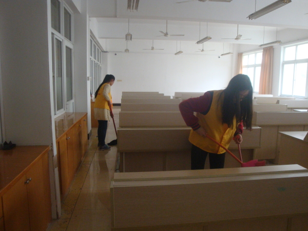 为给我院的老师和同学们营造一个健康清洁的工作和学习空间,使老师和同学们在舒适干净的环境中轻松愉快的工作和学习。3月23日下午,我院志愿者部组织35名志愿者对敬业楼的教室、走廊、办公室以及机房进行了义务打扫。