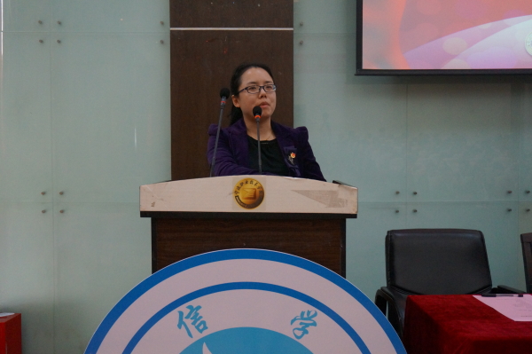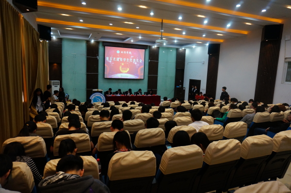 图为:会议过程中 大会在庄严的国歌中拉开帷幕。首先校团委书记励宁老师进行了发言,他高度评价了电信学院团委学生会上学期的工作,并肯定了电信学子独特的修养和在学校各项活动中的优秀表现。并提出了对于电信学院的希望和建议,对我院的学生会发展寄予期待。紧接着我院副院长汪志达副教授对团委学生会2014年的工作进行了汇报总结,表示团委学生会在过去的工作中团结互助、相互学习、工作井然有序,学院学风建设良好,科技创新氛围浓厚,并对2015年进行展望,对今后工作方向及重点加以说明。 会议第二项议程是电信学院第四届学生会主席团成员发言。电信学院团委副书记王舒敏同学做题为“立足新起点,树立新目标,创造新佳绩,共建充满活力的电信学院”的代表大会工作报告。王舒敏同学从一年来的工作回顾和对未来工作的展望两部分进行报告,报告肯定了电信学院团委学生会学生工作的优良传统进行传承,并研究规划今后近年我院团学工作的发展方向。电信学院学生会主席赵涛同学在学生会工作报告中着重凸显了了我院“青春、活力、创新”的精神。在完善团队建设,和举办精彩活动等方面,赵涛同学回顾电信学院一年的发展,充分体现了电信学院学子良好的精神风貌。