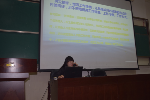 会议伊始,组织部部长庄莎莎由“一头狮子带领的羊群可以打败一只羊带领的狮群”小故事的引导下切入了正题。分别从完善自己、提高自我的管理意识、树立集体荣誉意识、担当责任、善于沟通等七个方面为我们讲解了管理者既要加强学习、提高素质;同时要树立良好形象,加强管理。要注重严于律己,以身作则。组织部部长庄莎莎表示:“我们根据不同的性格和爱好,就采取不同的沟通方式。让生活在这个集体里的人真切地、深深地体会到集体的温馨和幸福。因为只有管理者身先力行,携手大家共同去创造,共同去努力营造,我们才会有一个良好的、和谐的工作团队,所以每一个成员才会格外珍惜这个温馨的和谐的大集体,并把它视为幸福的“家”。最后,庄莎莎与干事们进行互动,让大家畅聊在学生会的收获,干事们在一片欢乐中进行相互沟通、交流。