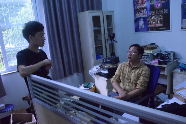 陈光绒,工程硕士,副高职称。2002年到宁职院工作,一直从事单片机技术应用、电子产品分析与制作等课程的教学,负责“电子产品分析与制作”国家级精品课程建设,获得二项“实用新型”专利,主持“新型按摩浴缸的研制”省级课题研究,主持完成10项院级课题。曾获全国大学生电子设计竞赛浙江赛区“优秀组织工作者”、市宁波市高校系统“三优秀三文明”优秀教职工、院级优秀教师等称号,多次指导学生参加各类竞赛,并获得省一、二等奖。 要在众多作品中脱颖而出,选题至关重要。对此,陈老师胸有成竹的说道“每次选题之前,我们都会对历届获奖作品做深入的分析,总结获奖作品的特点,再结合社会热点,从生活中寻找灵感。”随后陈老师在谈及工作时间的问题上说“现在学生下了课就往工作室跑,毕竟寝室的学习环境的工作室不同,在工作室,能更好的投入到工作中,学到书本上没有的知识”