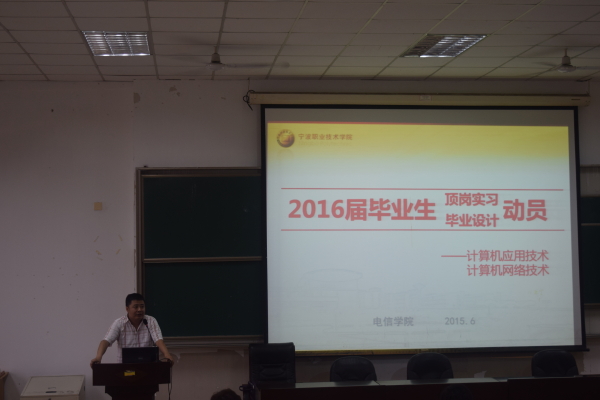 | 为进一步完善毕业生顶岗实习和就业工作,引导学生做好顶岗实习的心理准备,2015年6月23日下午4点,电信学院在精技楼503召开2016届毕业生顶岗实习动员大会。电信学院副院长汪志达、网络技术教研室主任李如桃、计算机教研室主任李超燕、辅导员刘利峰和2013级计算机大类专业同学参加了此次大会。大会由李超燕老师主持。