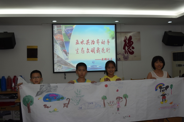 图为:观看视频 “五水共治”是推进浙江新一轮改革发展的关键之策。五水共治是指治污水、防洪水、排涝水、保供水、抓节水这五项。五水共治是一石多鸟的举措,既扩投资又促转型,既优环境更惠民生。水文化的价值在于它让人们懂得热爱水、珍惜水、节约水;进行五水共治,是平安浙江建设的题中之义,直接关系平安稳定、关乎人水和谐。可治理自来水、江水、河水等水流的污染问题。 为了宣传这一策略,也借这个机会让小朋友们能更好的了解五水共治这一理念,在第二节课我们举行了大家一起来画横幅活动,让小朋友们都参与进来一起画横幅,大家都画得很有艺术感,也有画的很抽象的,场面别开生面,最后在小朋友合影中结束了本次课程。