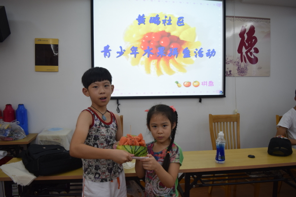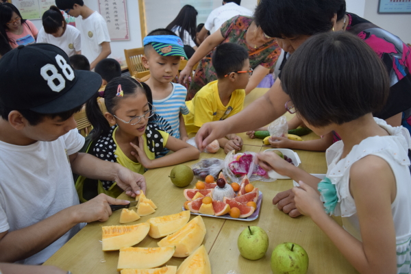 | 为了激发小朋友们的想像力与培养小朋友们的动手能力,2015年7月29日,在安静的早自习过后,进入了今天的假日课堂.今天的假日课程,黄鹂社区组织了课堂活动水果拼盘。小朋友们都带来了自己喜欢的水果,经过自由组队,一共组成四支队伍。电子信息学院团委书记陈宇老师也加入本次课堂。