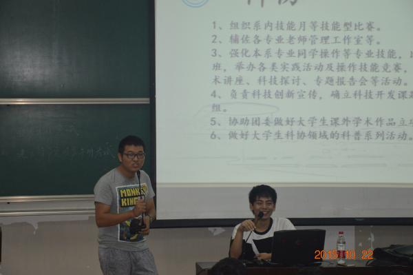 会议伊始,主席团助理曾一珉由“希形”来源于《道德经》中“大音希声,大象无形”含义的引导下切入正题。分别向我们介绍了15个部门的职责,每介绍一个部门他都会先选出一个代表来介绍所在部门的职责后由他补充说明。首先由科协干事项王杰进行了介绍,紧接着是组织部干事倪罕杰为我们带来了一首“trouble is a friend”将课堂推向了高潮。介绍完后,主席团助理曾一珉让每个部门的干事自愿的上去做自我介绍,各部门干事积极参加,上台介绍的人连绵不绝,最后在文娱部干事方龙辉精彩的“Beat Box”声中落下帷幕。在即将结束之际,主席团曾一珉表示:“我们要积极融入学生会这个大集体,携手共同去营造一个温馨的和谐的‘家’”并与干事们进行互动,干事们在欢快中进行交流、畅聊自己在学生会中的收获。