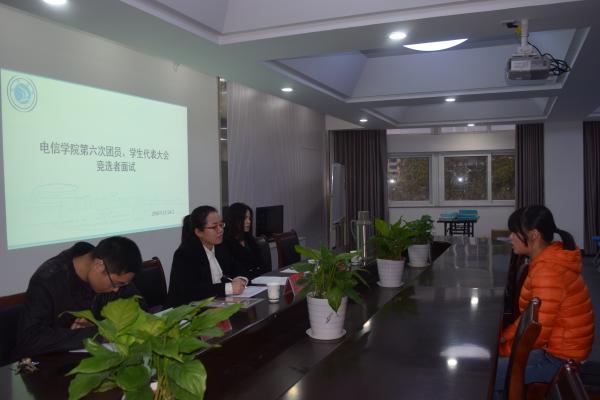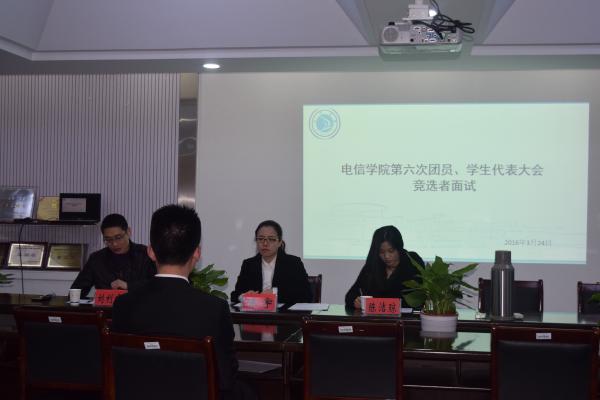 | 2016年3月24日下午5点30分,宁波职业技术学院电信学院“第六次团员、学生代表大会竞选者面试”于敬业楼“党员之家”顺利召开。出席本次面试的面试官有电信学院团委书记陈宇老师、学工部主任刘利峰老师以及辅导员陈洁琼老师。