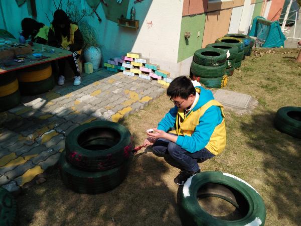此次活动负责人让9个志愿者们,对已经油漆好的轮胎进行美化,来装饰幼儿园的沙坑池,每个志愿者拿起画笔,再轮胎上随意作画,一开始的志愿者们思维十分局限不知道画什么,慢慢的志愿者们开始在轮胎上画下自己喜欢的图案,展现出童真的一面,经过美化过的轮胎,原本暗淡的样子消失了,展现出别样的绚丽。七彩的颜料,七彩的轮胎,相信幼儿园的小朋友们,看到这些美丽的轮胎会变得更开心。