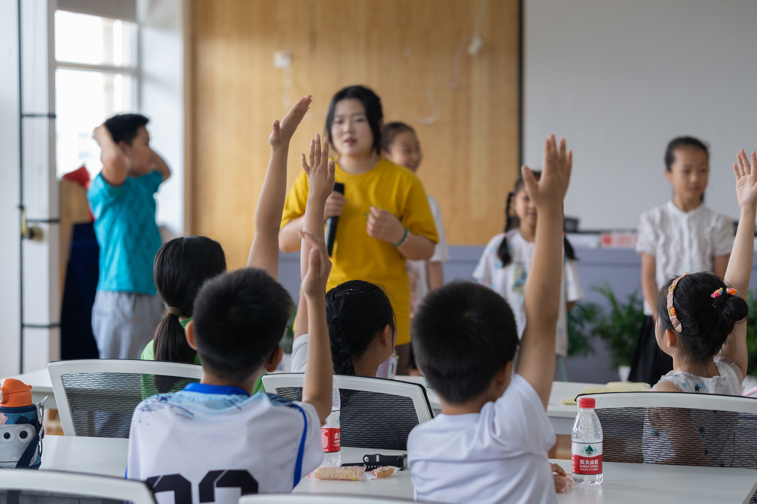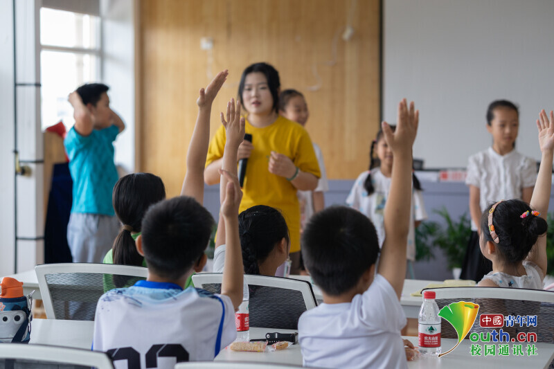 图为学苑社区假日学校的小朋友们正在踊跃举手发言。中国青年网通讯员 蒋哲 摄