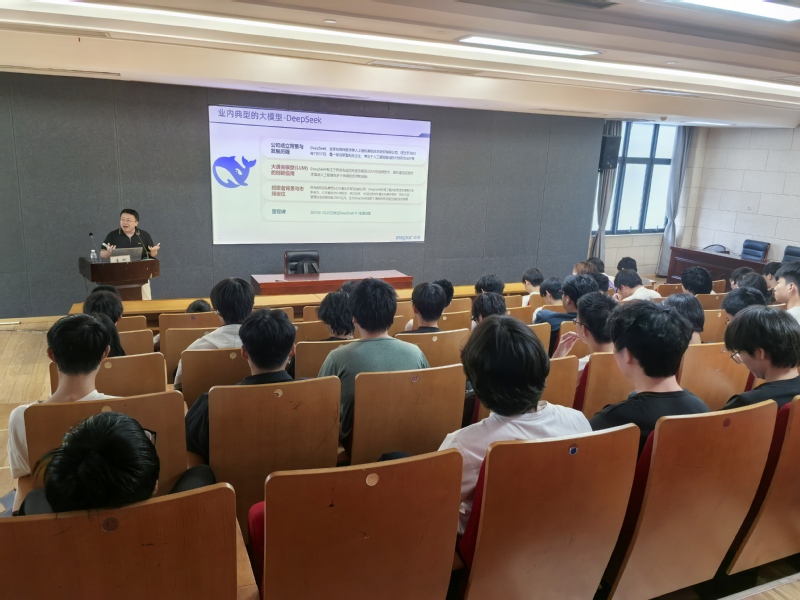 讲座中,唐刚总监从人工智能的起源讲起,以达特茅斯会议为切入点,串联起人工智能七十余年的技术演进史。针对学生关心的“大模型如何运作”问题,他以DeepSeek模型为例,将其比作“数据喂养的超级大脑”, 强调“算法优化比算力堆砌更能体现创新价值”。