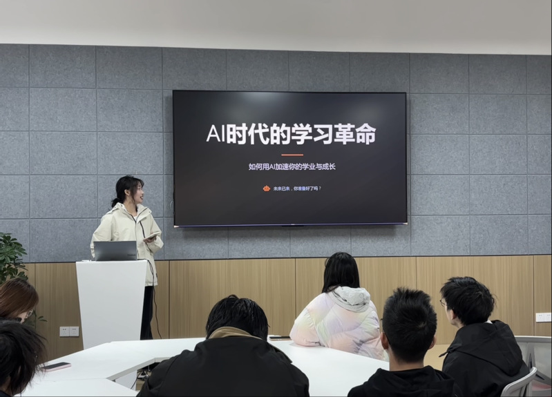 读书会开始后,易鑫钰老师首先用一段视频引出当前AI工具的先进性和当前时代AI使用的各种情况,让同学们引起极大的共鸣和震撼。而后,利用一份在上学期收到的、未经任何修改的AI生成作业展示,瞬间在观众席中激起了一阵窃窃私语与深思。老师讲述道:技术本身无对错,关键在于使用技术的人。我们聚集于此,不是为了给出一个标准答案,而是为了共同直面这个时代之问:当AI比我们学得更快、记得更牢,我们人的独特价值何在?我们究竟为何而学?会上,四位同学上台根据读书内容和议题进行观点分享和讨论,大家从不同维度结合自己的专业学习和使用AI工具的经历,陈述了各自的观点。