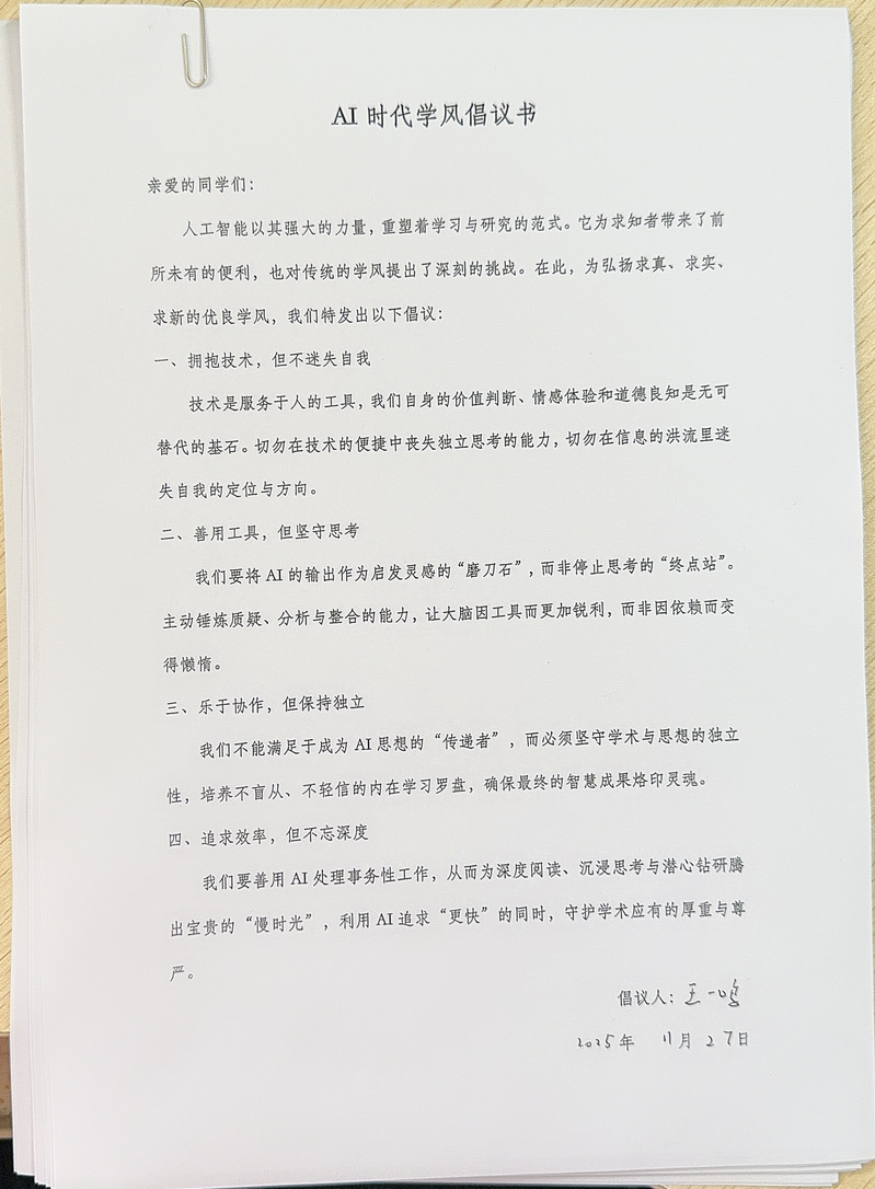 所有思考汇聚到一个行动性问题:在AI的辅助下,我们学院应倡导一种什么样的“新学风”?同学们踊跃贡献关键词,瞬间角色转换,从“使用者”变为“审视者”,将所有观点总结成一份“学风倡议书”,并进行签署仪式。