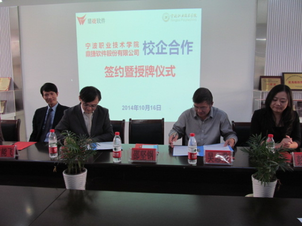 2014年10月16日,电信学院与鼎捷软件股份有限公司校企合作签仪式在敬业楼二楼党员之家隆重举行。鼎捷软件有限公司副总裁陈义忠先生、知识学院副总经理彭俐颖女士、宁波分公司总经理袁能飞先生、知识学院院校合作部经理李罡先生以及我院党委副书记邵坚钢、教务处王灵玲、电信学院院长吴志荣、副院长汪志达、计算机应用技术专业主任孟德欣、网络技术专业主任李如桃,计算机应用、网络技术专业全体教师和ERP应用教学班级25名学生代表出席此次签约仪式。