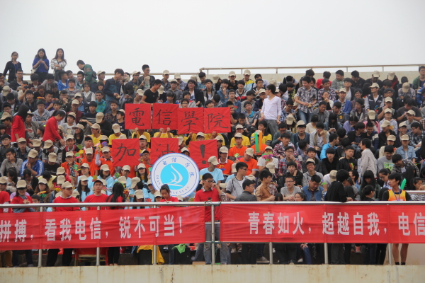 记者还未走进看台,“胜东方,秒蓝翔,电信学院我最强”激昂口号响彻运动场,为我院的运动健儿加油鼓劲。当运动员取得好的成绩时,拉拉队便欢呼雀跃,并为运动员献上热烈的掌声。当运动健儿落后时,我们的啦啦队就用鼓励的话语为他们打气。嗓子哑了,手拍酸了,啦啦队们也都毫不在乎,一如既往地坚守着自己的岗位,为我院的荣誉默默地做出贡献。低调的是他们的身影,高调的是他们的呐喊。志愿者部部长助理余佳英告诉记者:“虽然偶尔下起小雨,但是浇熄不了啦啦队队员的热情。”