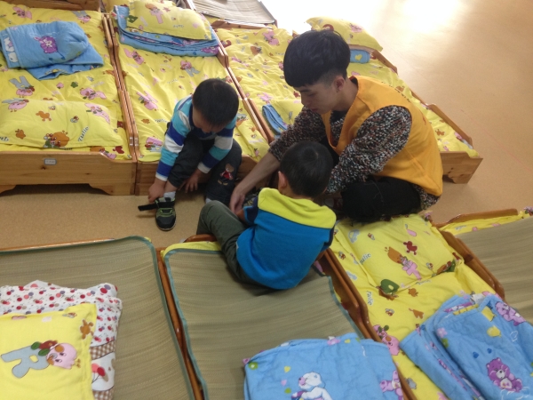 下午2点,活动正式开始,志愿者们积极的参与到此次活动之中。志愿者们分为三组分别进入三个小班。志愿者们为小朋友们准备好睡后的小点心。帮助孩子们穿好衣服,教小朋友把被子叠好,并将床位排列整齐。紧接着,志愿者们分别与孩子们进行交流,教孩子们学习一些简单而有趣的儿歌,用各自学到的知识给孩子们带去欢乐。小朋友以他们欢快的舞蹈及清澈的歌声表达对志愿者们的谢意。表演结束后,老师以开“小火车”的方式带领孩子们到操场玩游戏。孩子们在志愿者的细心看护下在活动设施上自由玩耍,最后志愿者们帮助老师整理好队伍带孩子们回到教室。